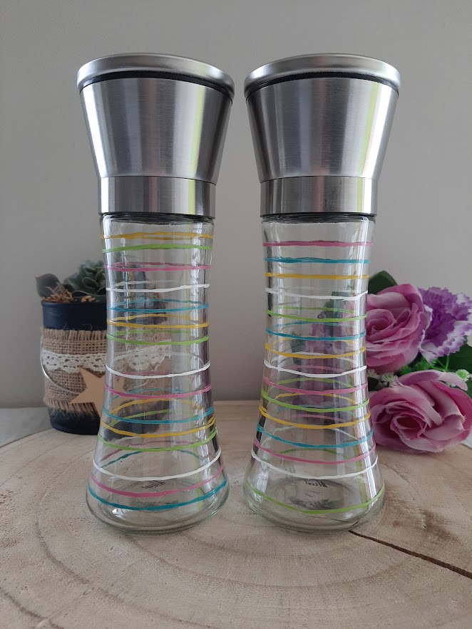 Vous recherchez un cadeau cuisine original qui allie style et utilité ? Ce duo de moulins à poivre et sel est l’accessoire parfait pour apporter immédiatement de la joie dans une cuisine. Décorés à la main avec un motif de lignes horizontales multicolores — rose, jaune, turquoise, vert clair et blanc — ces moulins en verre transforment des ustensiles essentiels en véritables objets d’art.