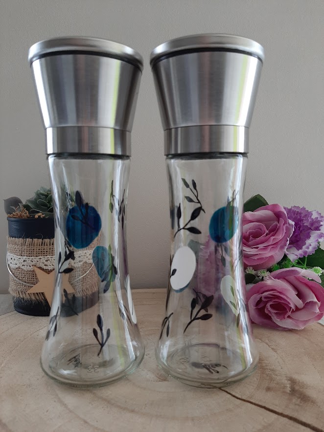Vous recherchez un cadeau cuisine original qui allie délicatesse et utilité quotidienne ? Ce duo de moulins à sel et poivre en verre est l’accessoire idéal pour sublimer vos repas. Décorés à la main avec un motif de feuillages fins noirs et des touches circulaires bleues et blanches, ces moulins transforment vos assaisonnements en véritables objets de décoration.