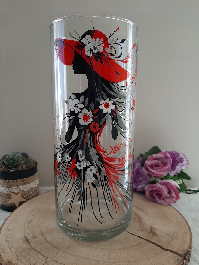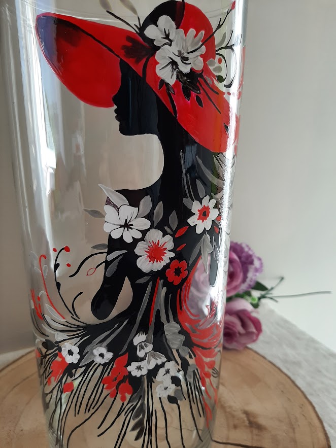 Vous êtes à la recherche d’un cadeau femme original qui sorte de l’ordinaire ? Ce vase de 30 cm de hauteur est une véritable ode à l’élégance. Entièrement peint à la main dans mon atelier en Vendée, il met en scène une silhouette féminine de profil, portant un large chapeau rouge éclatant et une robe composée de fleurs délicates et de motifs végétaux noirs et blancs.