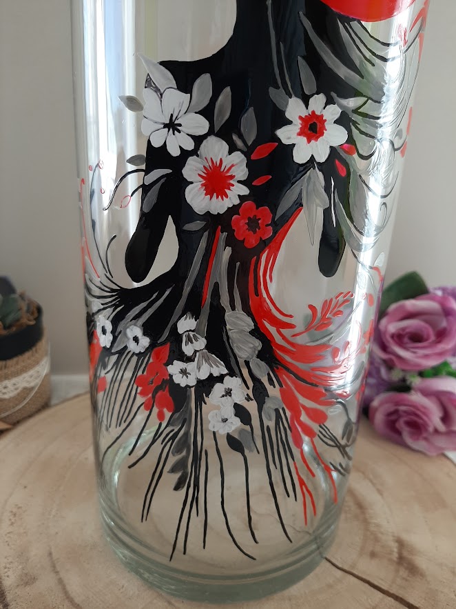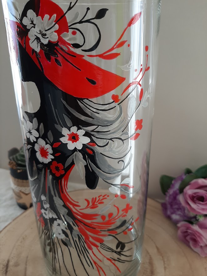 Choisir ce cadeau femme original, c’est offrir une pièce unique. Contrairement aux produits de grande distribution, ce vase est travaillé au pinceau avec une attention particulière portée aux détails floraux et aux jeux de contrastes entre le rouge passion, le noir profond et la transparence du verre.