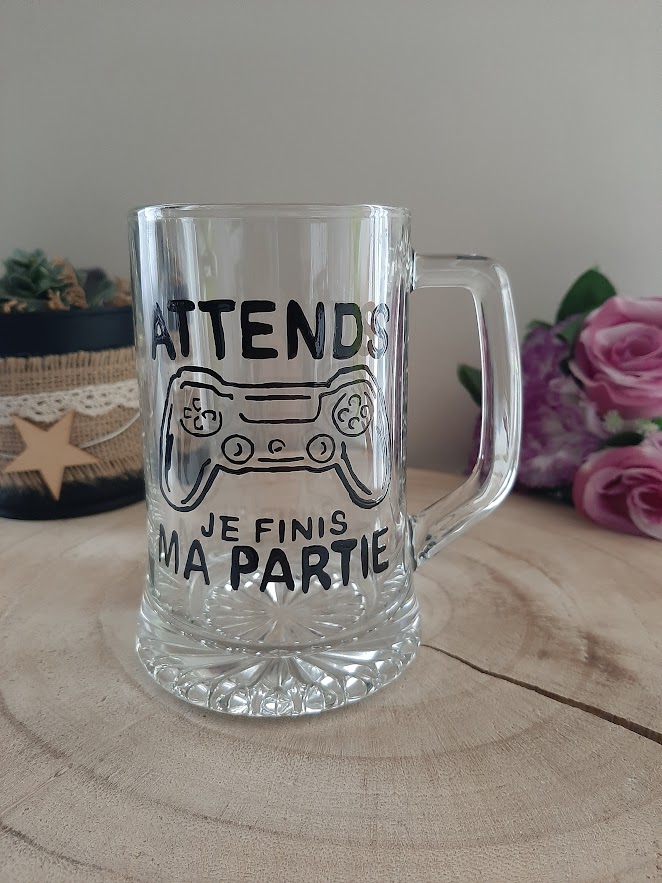 Vous cherchez une chope à bière originale ? C’est d’ailleurs le cadeau parfait pour un fan de jeux vidéo. Ce modèle exclusif montre une manette de console dessinée avec soin. Le texte « Attends je finis ma partie » apporte ainsi une touche d’humour géniale. Par conséquent, c’est l’objet idéal pour vos soirées devant l’écran.