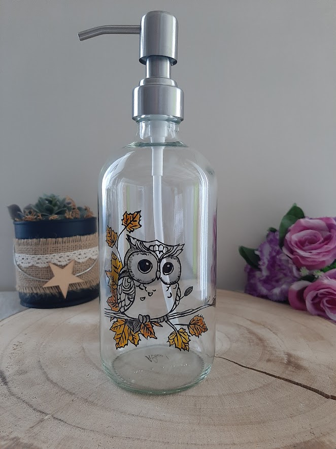Vous souhaitez ajouter une note de poésie à votre quotidien ? Ce distributeur de savon original en verre est une création unique qui saura vous faire sourire. J’ai dessiné cette petite chouette aux grands yeux expressifs perchée sur une branche délicate. Ensuite, j’ai ajouté des feuilles aux nuances orangées pour rappeler la beauté de l’automne. Par conséquent, cet objet utilitaire devient un véritable petit tableau de verre pour votre maison.