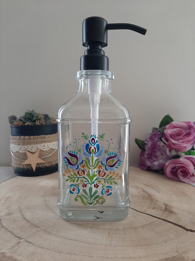 Distributeur de savon en verre peint à la main – Motif Folklorique