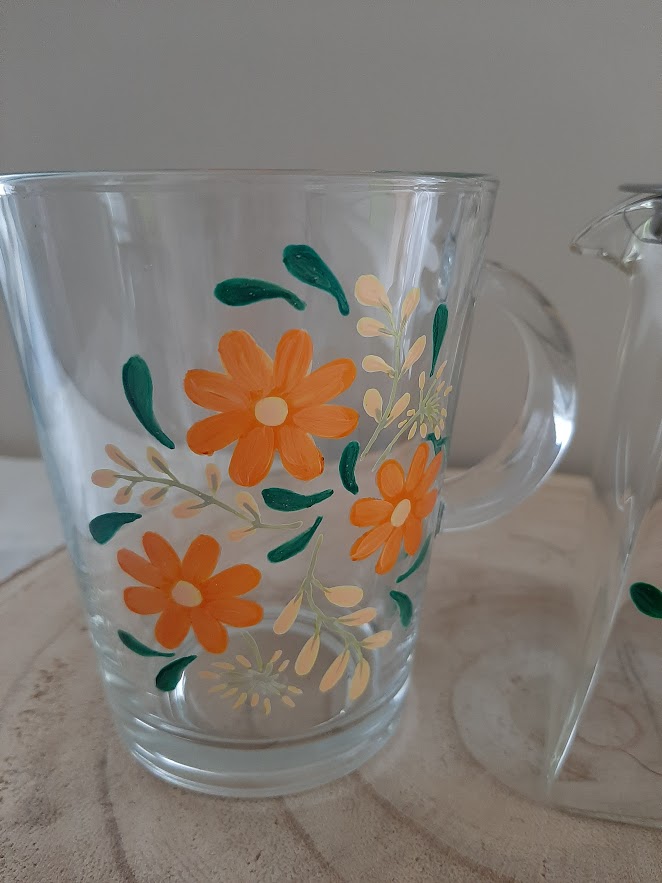 Je réalise entièrement ce décor dans mon atelier de Nalliers, en Vendée. Cet ensemble théière et mug artisanal bénéficie d’un savoir-faire précis. D’abord, je peins les fleurs et les feuillages verts à la main levée avec une peinture de haute qualité. Ensuite, je passe l’ensemble au four à haute température. Cette cuisson est primordiale. En effet, elle fusionne la peinture au verre pour une fixation permanente. C’est pourquoi vous profitez d’un objet d’art qui reste beau et brillant au fil des années.