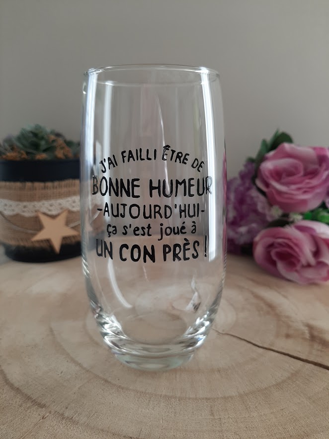 On a tous connu ces journées qui commencent bien… jusqu’à une rencontre impromptue. Ce gobelet haut affiche avec dérision : « J’AI FAILLI ÊTRE DE BONNE HUMEUR AUJOURD’HUI ça s’est joué à UN CON PRÈS ! ». C’est l’accessoire parfait pour décompresser après une longue journée ou pour offrir à un collègue qui a le sens de l’humour.