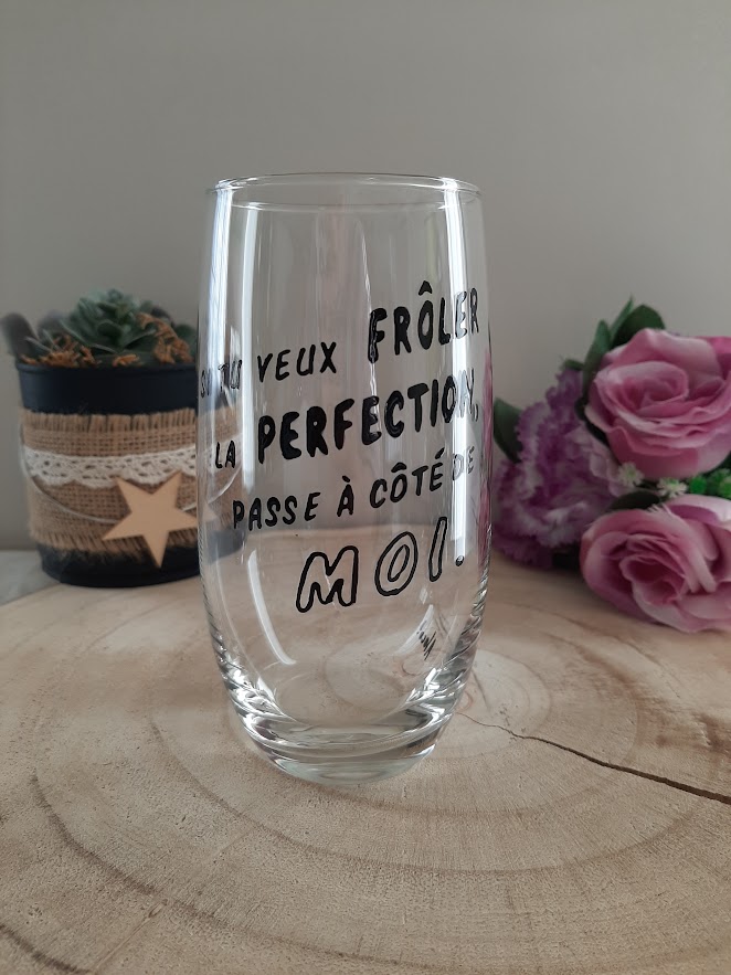 Pourquoi être modeste quand on peut être drôle ? Ce grand verre tube détourne les codes de la perfection avec un humour piquant : « SI TU VEUX FRÔLER LA PERFECTION, PASSE À CÔTÉ DE MOI. » C’est l’accessoire parfait pour égayer vos déjeuners, vos soirées entre amis ou pour offrir un clin d’œil original à une personne qui ne manque pas de caractère.