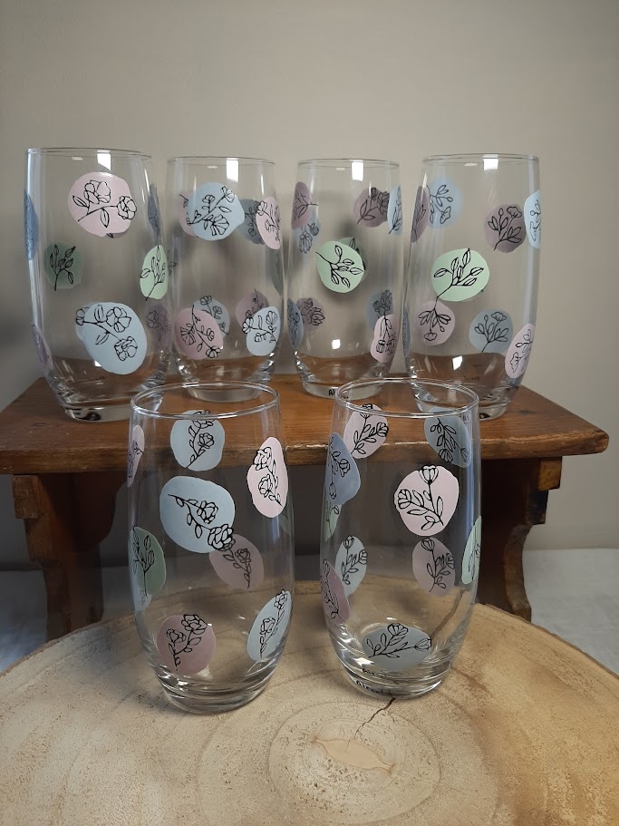 Verres élégants décorés de motifs floraux noirs sur des pastilles de couleurs douces. Chaque pièce est unique et peinte avec soin dans mon atelier de Nalliers.