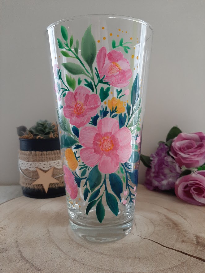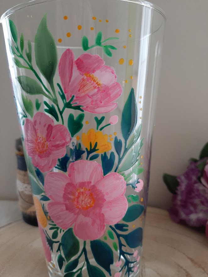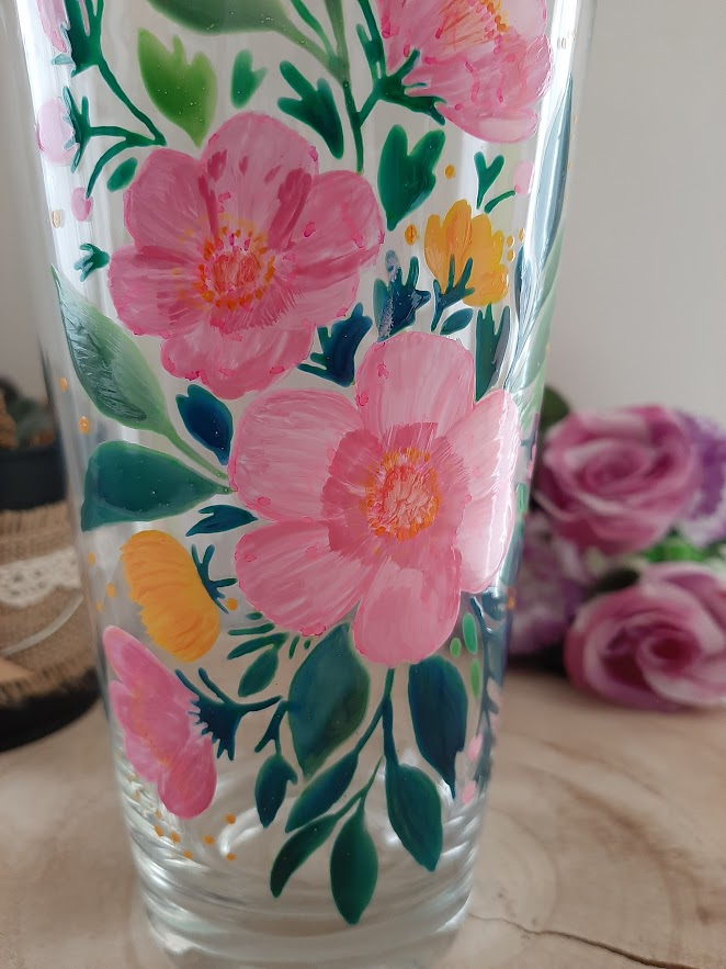 Petit vase en verre artisanal – Décor fleurs roses peint à la main