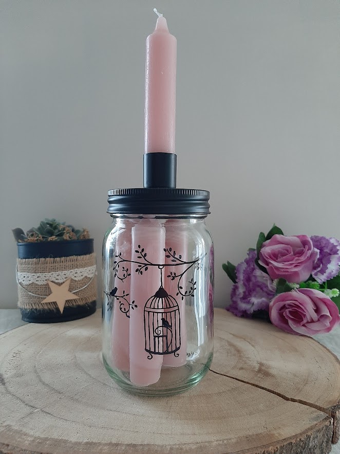 Bougeoir fonctionnel : Le couvercle en métal noir intègre un support pour bougie flambeau, tandis que le bocal sert de contenant esthétique pour stocker vos bougies de réserve.