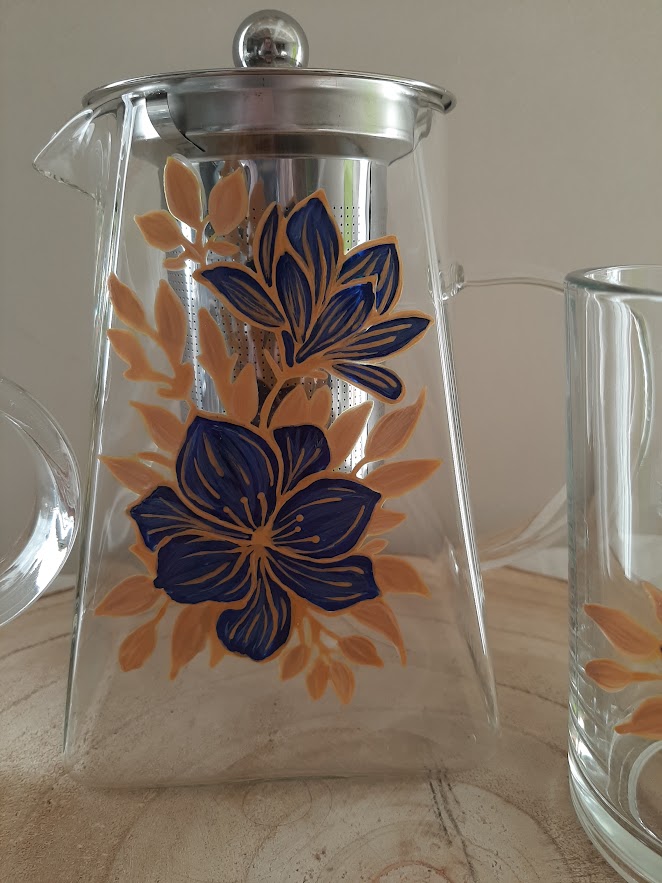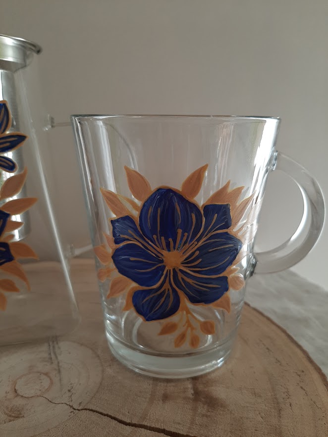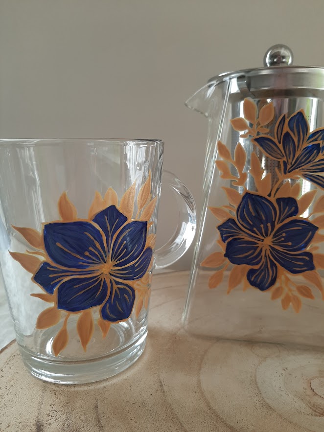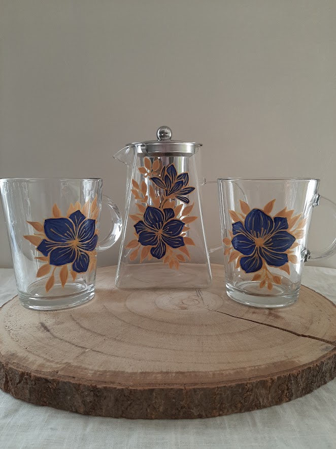Soyez le premier à laisser votre avis sur “Service à thé en verre avec théière et 2 mugs assortis – Décor fleurs bleues et dorées fait main”