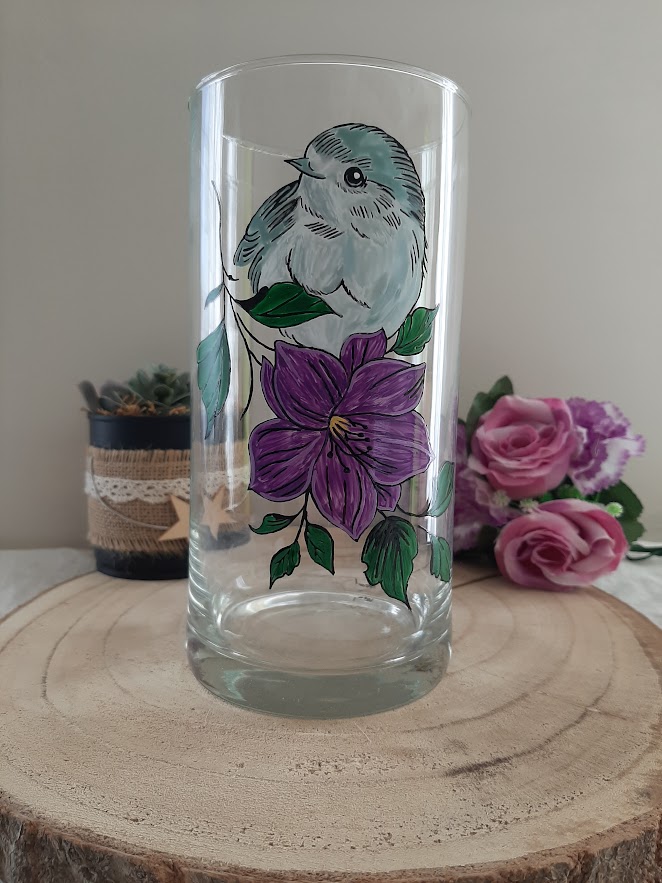 Ce vase cylindrique est une véritable peinture sur verre. L’oiseau est travaillé avec des nuances de bleu ciel et de gris, tandis que la fleur, évoquant une clématite, arbore un violet profond avec des détails blancs pour souligner le mouvement des pétales. Chaque feuille verte est peinte avec soin pour créer un ensemble harmonieux et vibrant.