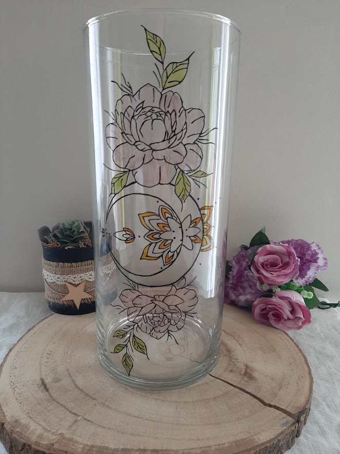 Apportez une touche de poésie à votre décoration avec ce vase peint à la main fleurs aux inspirations bohèmes. Orné de pivoines délicates et d’un motif lunaire central, ce grand vase cylindrique est une pièce d’artisanat unique réalisée avec finesse dans mon atelier vendéen.