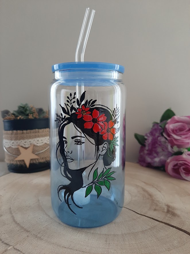 La qualité est d’ailleurs ma priorité pour que cette œuvre vous accompagne longtemps. C’est pourquoi je cuis le décor à haute température après la peinture. Ce procédé permet alors de fixer le motif de façon permanente sur le verre. Votre portrait de femme gardera donc toute sa finesse et l’éclat de ses couleurs malgré vos utilisations quotidiennes. Le format canette est très tendance, agréable à tenir et surtout très pratique avec sa paille en verre.