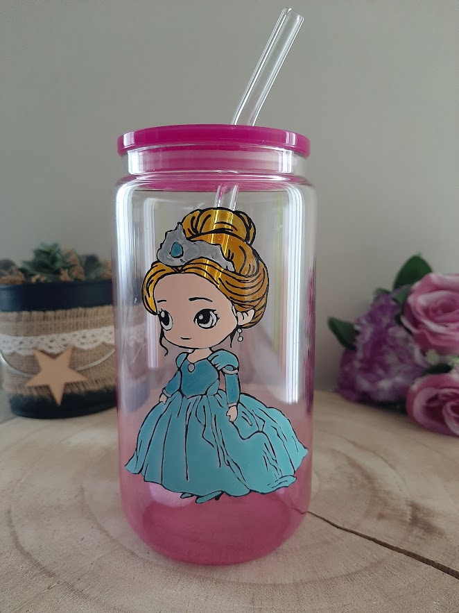 La résistance est d’ailleurs ma priorité pour les objets destinés aux enfants. C’est pourquoi je cuis le décor à haute température après la peinture. Ce procédé permet alors de fixer le motif de façon permanente sur le verre. Votre princesse gardera donc tout son éclat malgré les utilisations quotidiennes. Le format canette est très moderne et surtout très facile à manipuler grâce à sa paille en verre.