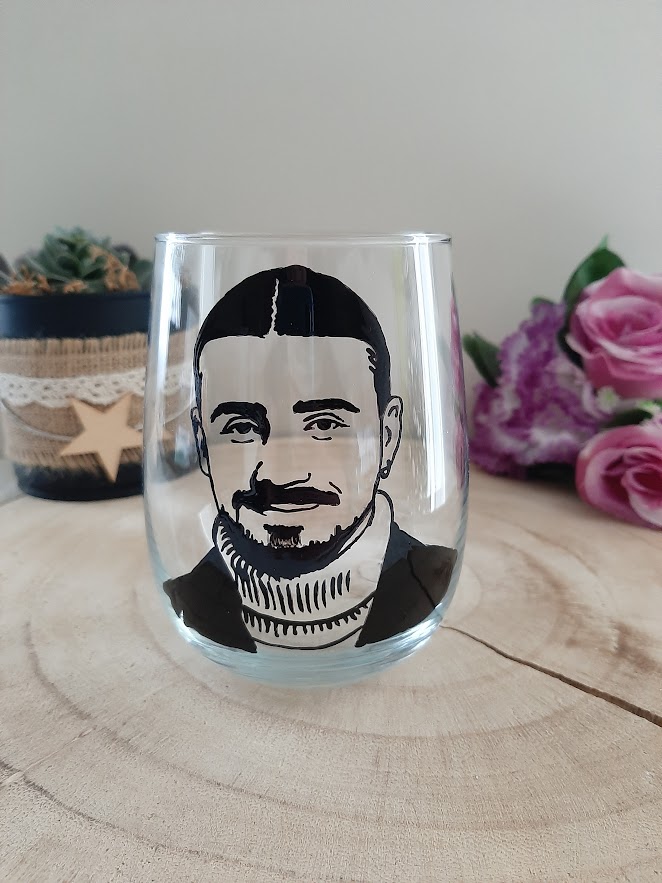 J’ai conçu ce verre pour capturer toute la présence de Pierre Garnier à travers un travail de peinture à la main levée. Chaque trait est appliqué au pinceau directement sur le verre, ce qui fait de votre exemplaire une pièce vraiment unique au monde.