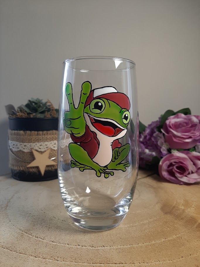 Motif : Grenouille souriante, signe de la paix, casquette et veste bordeaux.