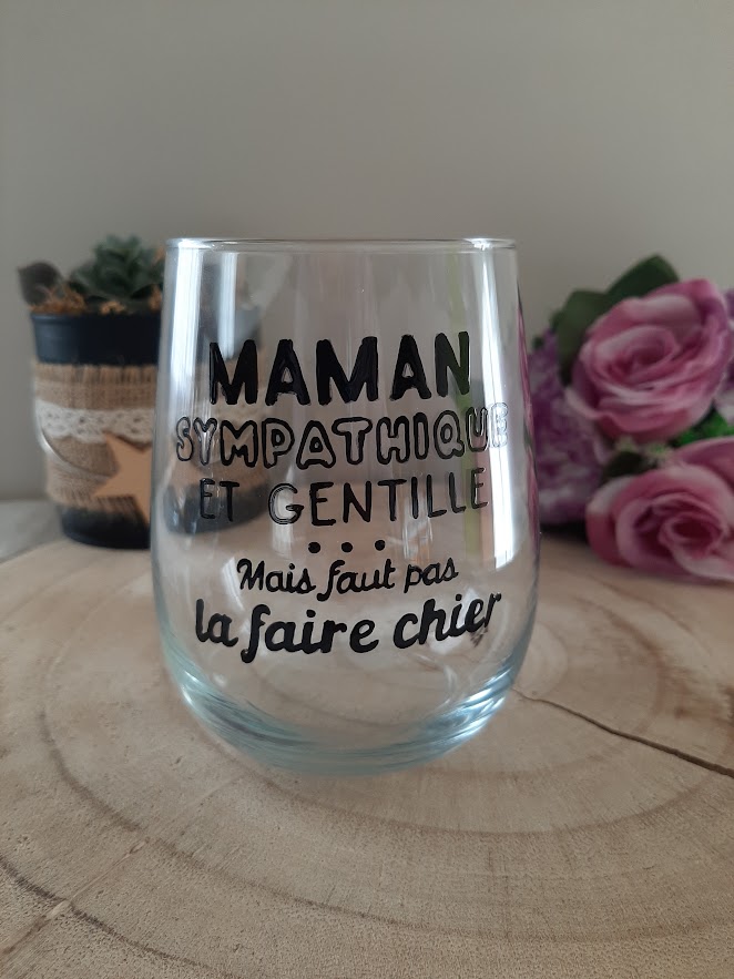 Vous cherchez un cadeau qui a du caractère ? Ce verre original est fait pour les mamans qui ont de l’humour et qui assument leur personnalité ! Le contraste entre la calligraphie soignée du début et le message final plus « cash » assure un succès garanti lors d’un anniversaire, pour la fête des mères ou simplement pour un moment de complicité.