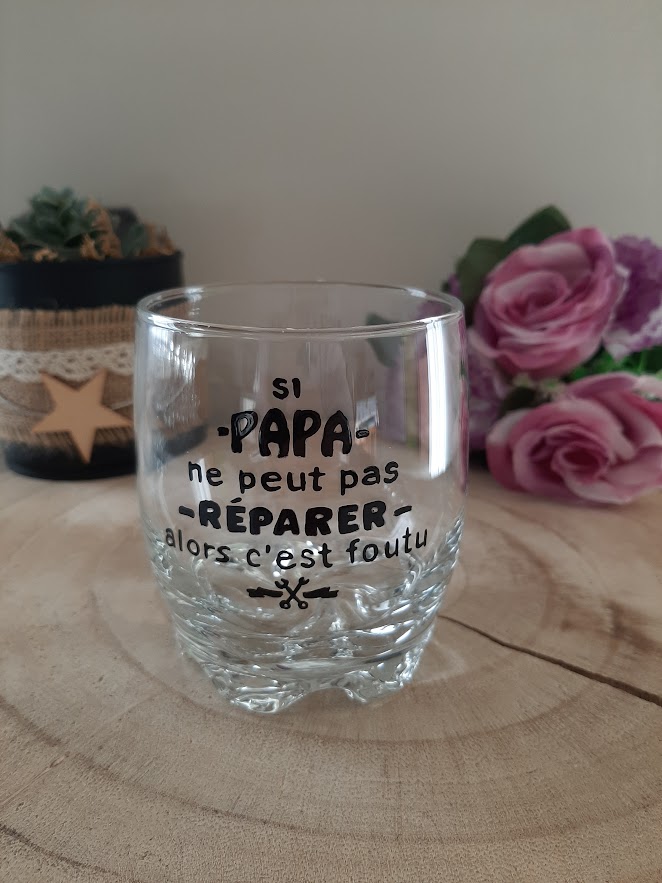 Célébrez le savoir-faire de votre père avec ce verre à dégustation unique. Portant l’inscription humoristique « Si Papa ne peut pas réparer alors c’est foutu », ce verre peint à la main en Vendée est le cadeau idéal pour tous les papas bricoleurs.