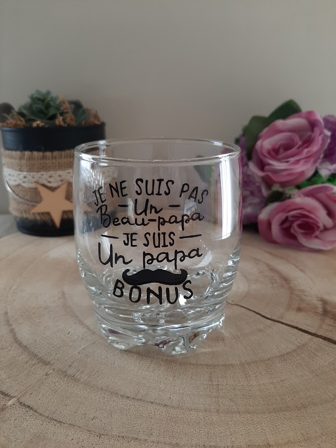 Ce verre arbore fièrement la phrase « Je ne suis pas un Beau-papa, je suis un Papa BONUS » soulignée d’une élégante moustache noire. Un design qui apporte chaleur et reconnaissance à l’heure de l’apéritif.